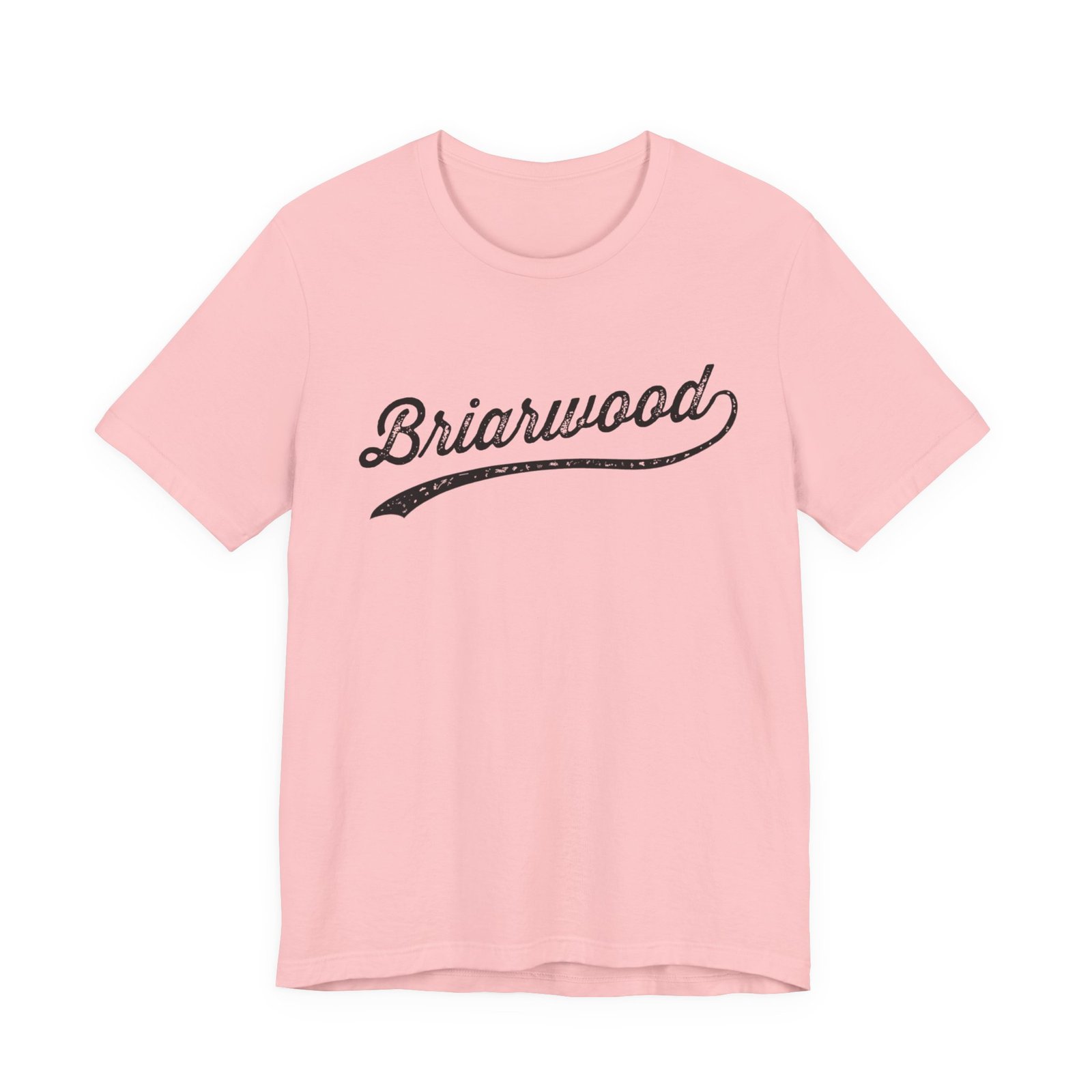 The image displays the word “Briarwood” in a stylized, vintage script typography with a distressed, weathered texture. The lettering features a sweeping underline that extends across the bottom of the text, adding a dynamic and elegant flourish to the design. The typography appears to be inspired by classic baseball team or retro signage lettering, with a slightly worn, aged appearance that gives it a nostalgic and timeless quality. The font is bold and cursive, with smooth, interconnected letters that flow into one another. The distressed effect adds character and a sense of history to the text, making it look like a well-worn, cherished logo or emblem.