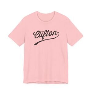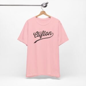 The image displays a stylized, retro-inspired text rendering of the word “Clifton” in a distinctive cursive script. The typography features a weathered, distressed texture that gives the lettering an aged and vintage appearance. The design incorporates a sweeping underline that extends from the bottom of the text, adding a dynamic and decorative element to the composition. The lettering has a bold, flowing style reminiscent of classic logo design or mid-20th century branding techniques. The textured effect creates a sense of depth and character, suggesting wear and history within the typographic treatment.