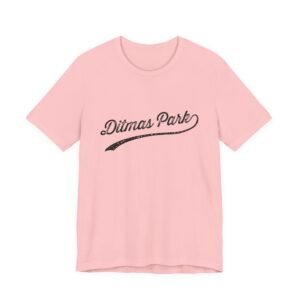 The image displays the text “Dimas Park” in a stylized, vintage-inspired script font with a weathered, distressed texture. The lettering appears to have a retro or classic design aesthetic, reminiscent of mid-20th century signage or branding. The typography features smooth, connected cursive letters with a slightly worn, aged appearance that gives the text an authentic, nostalgic feel. The text is rendered with a slightly uneven, textured finish that suggests a hand-crafted or screen-printed quality. The design has a sweeping underline that extends beneath the text, adding to the dynamic and flowing visual style of the typography.