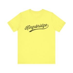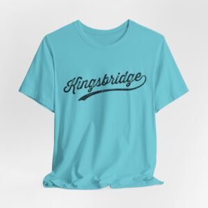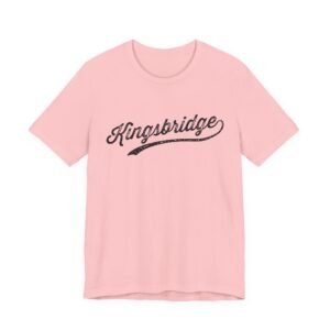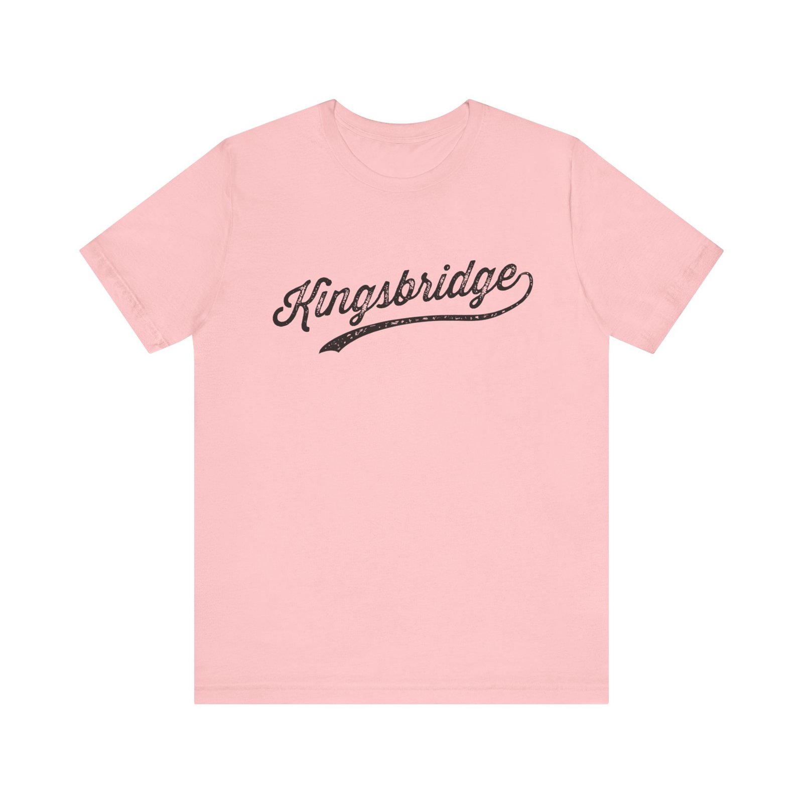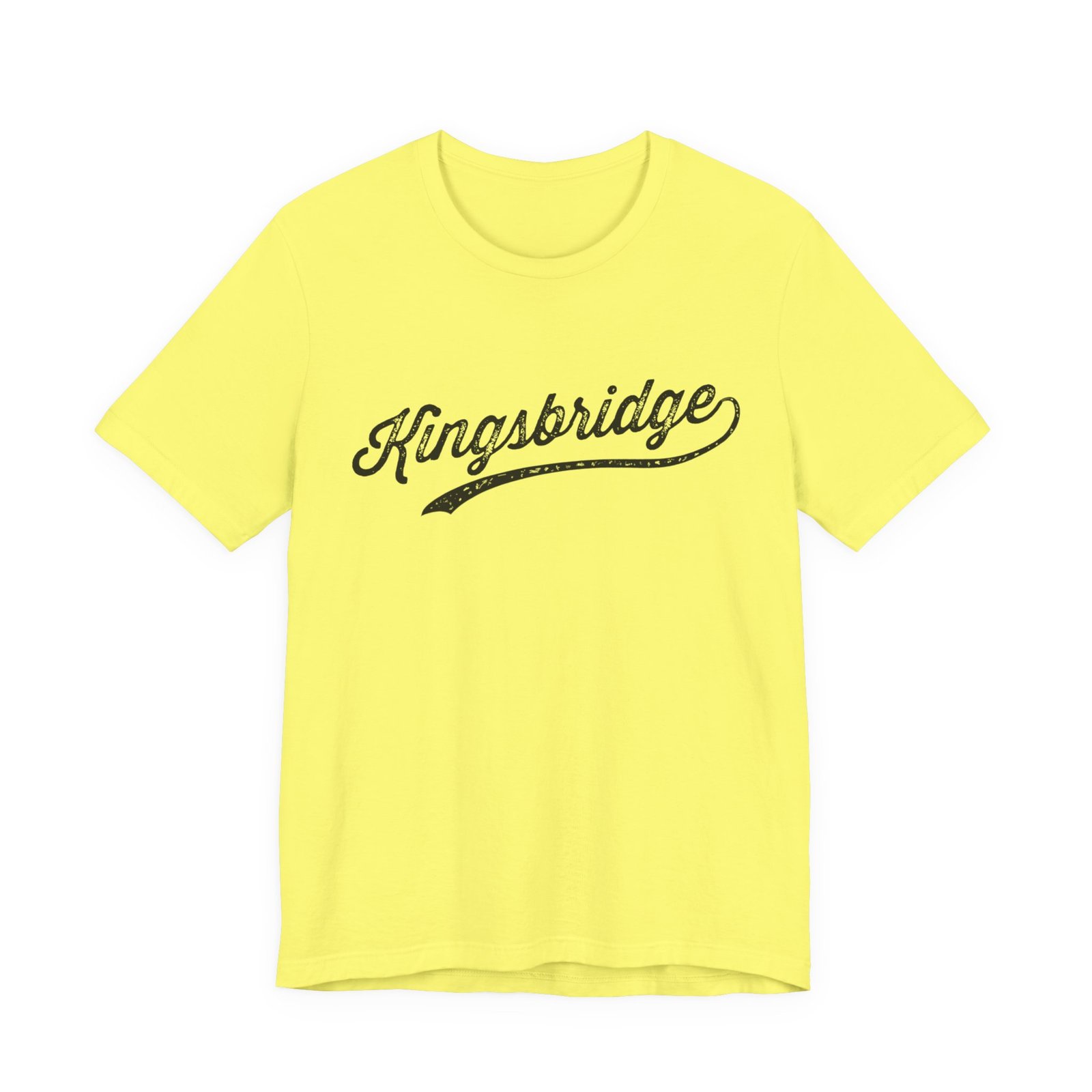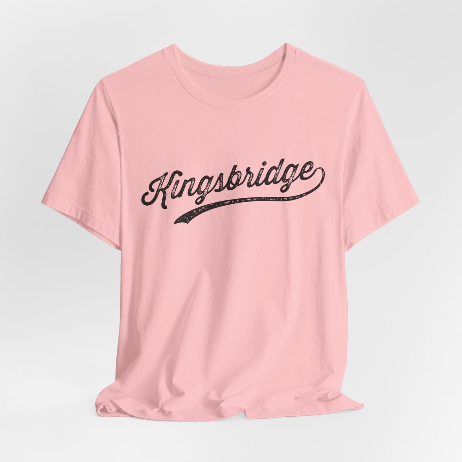 This image features the word “Kingsbridge” displayed in an elegant cursive script font with a distinctive vintage baseball-style design. The lettering showcases flowing, connected characters that curve gracefully across the composition, complete with a classic swoosh or tail element extending from the final letter. The typography exhibits a distressed or weathered texture throughout, giving it an authentic retro appearance reminiscent of classic sports team logos or vintage signage. The script style emphasizes smooth, flowing lines with varying stroke weights that create visual interest and movement. This decorative text treatment would be ideal for branding applications, sports merchandise, or any design requiring a nostalgic, athletic-inspired typographic element.