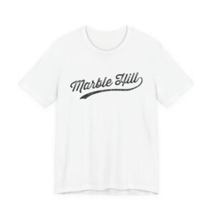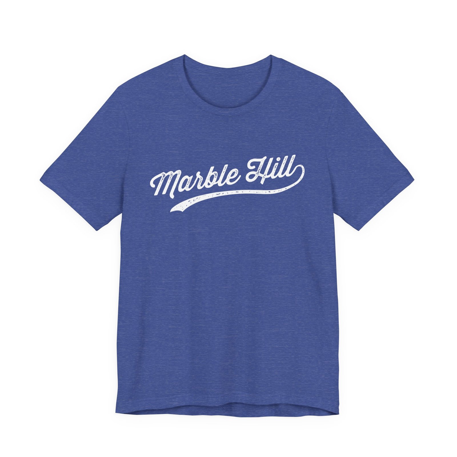 The image displays a stylized text logo reading “Marble Hill” in a vintage, distressed script typeface. The lettering features a swooping, curved underline that extends beneath the words. The typography has a worn, weathered appearance with scattered speckles and texture that gives it an aged, vintage aesthetic. The font is bold and dynamic, with a cursive-like flow that suggests a classic, nostalgic branding style. The design appears to be a logo or wordmark, likely for a brand, location, or graphic design project.