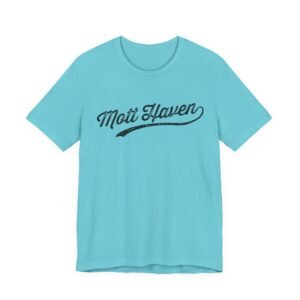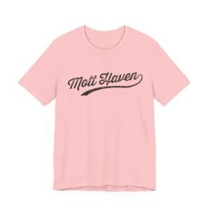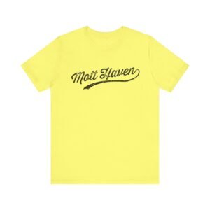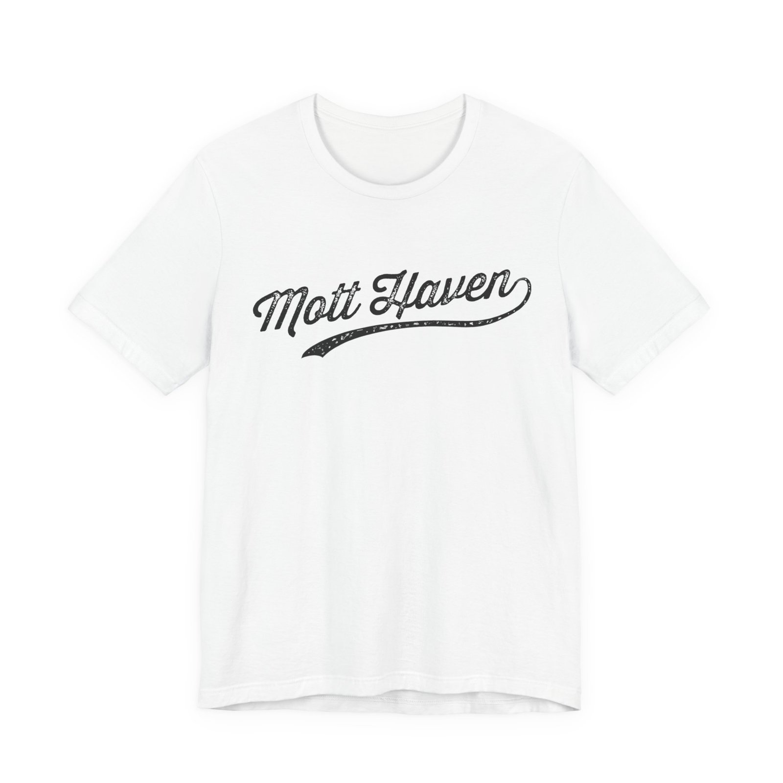 The image displays a stylized text logo reading “Mott Haven” in a vintage, distressed script typography. The text features a sweeping underline that extends beneath the words, adding a dynamic flourish to the design. The lettering has a weathered, textured appearance with scattered specks and imperfections that give it an aged, worn-out aesthetic. The font style evokes a nostalgic, retro feel reminiscent of classic sports team logos or vintage signage. The typography is clean and bold, with a cursive, flowing character that suggests movement and energy.