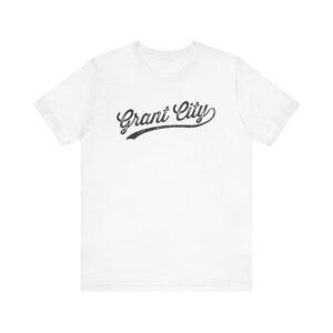 The image features a stylized text logo reading “Grant City” in a vintage, distressed script typography. The lettering has a weathered, worn appearance with textured edges that give it an aged, nostalgic feel. The font is cursive and flowing, with elongated connections between letters and a sweeping underline that extends beneath the text. The design appears to be a retro-inspired branding or graphic design element, reminiscent of classic signage or vintage merchandising typography. The text is rendered in a bold, prominent style that suggests a sense of heritage and timelessness.