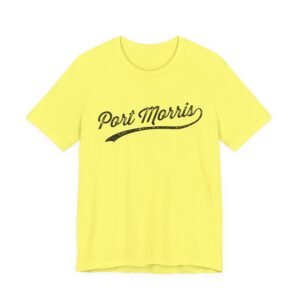 The image features a vintage-style, distressed typographic logo that reads “Port Morris” in a sweeping, cursive script. The text appears weathered and textured, with a worn, slightly grungy aesthetic that suggests an aged or heritage brand identity. The lettering has a dynamic, elongated design with a curved underline that extends beneath the text, adding a sense of movement and flair. The typography is bold and prominent, utilizing a classic script font that evokes a sense of nostalgia and timeless design. The distressed effect gives the logo an authentic, hand-crafted feel that might be associated with a local business, neighborhood, or product brand.