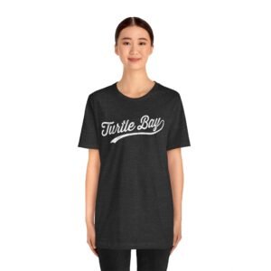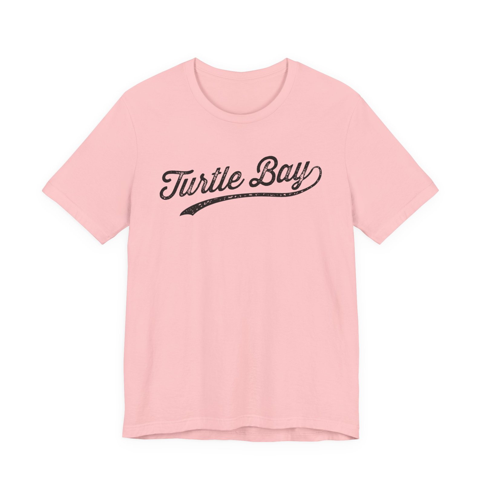 The image displays the text “Turtle Bay” in a stylized, vintage-inspired script font with a distressed, weathered texture. The typography features elegant, flowing cursive letters with a slightly grungy, worn appearance that gives it an antique or retro feel. Each letter has a rough, slightly uneven edge that suggests age and character, reminiscent of classic signage or hand-painted lettering. The text is rendered in a clean, bold style with a sweeping underline that extends beneath the words, adding to the dynamic and nostalgic design aesthetic. The overall graphic has a timeless, classic look that evokes a sense of heritage and established tradition.