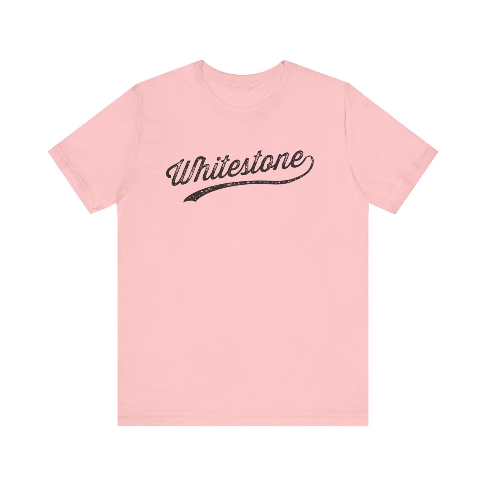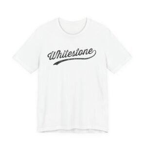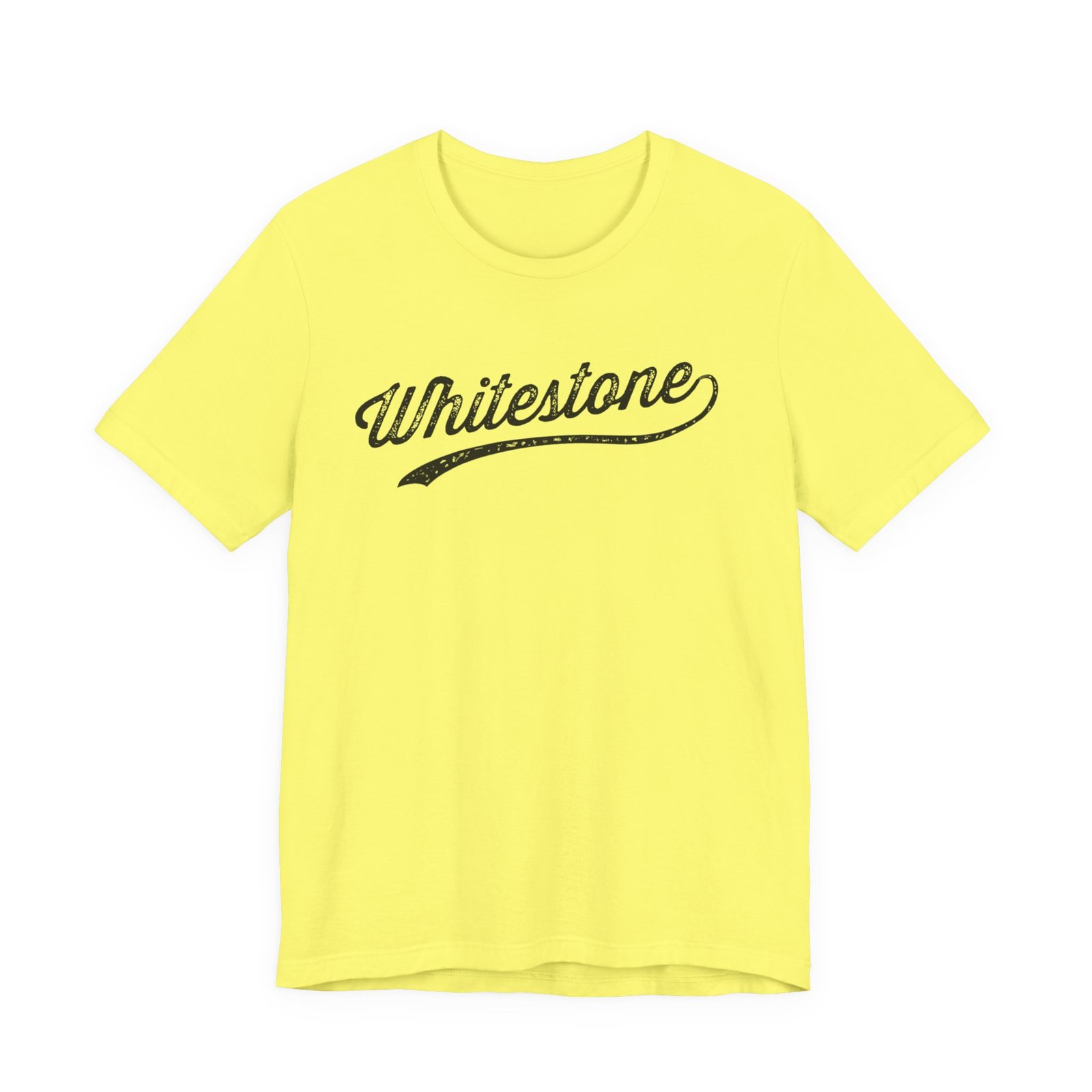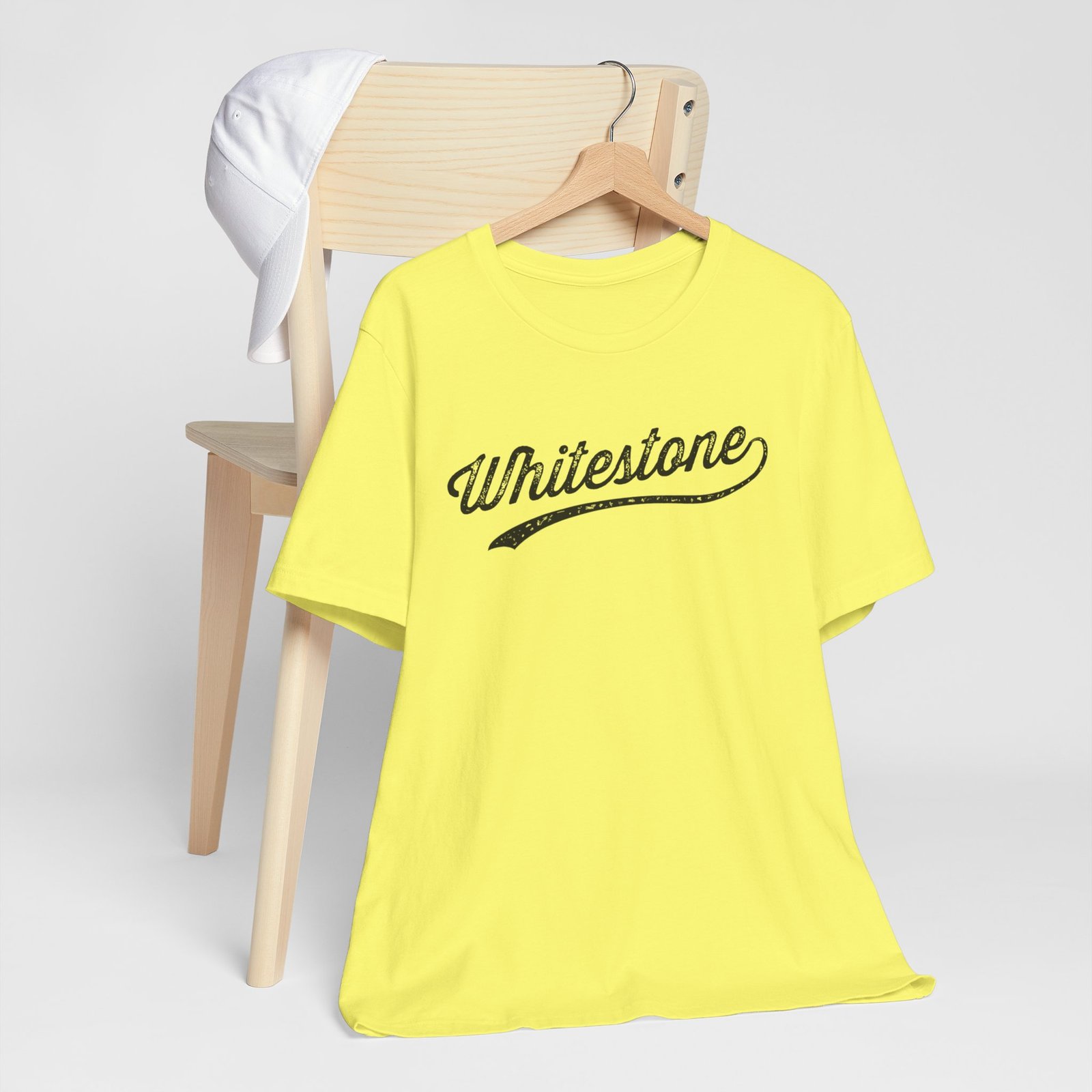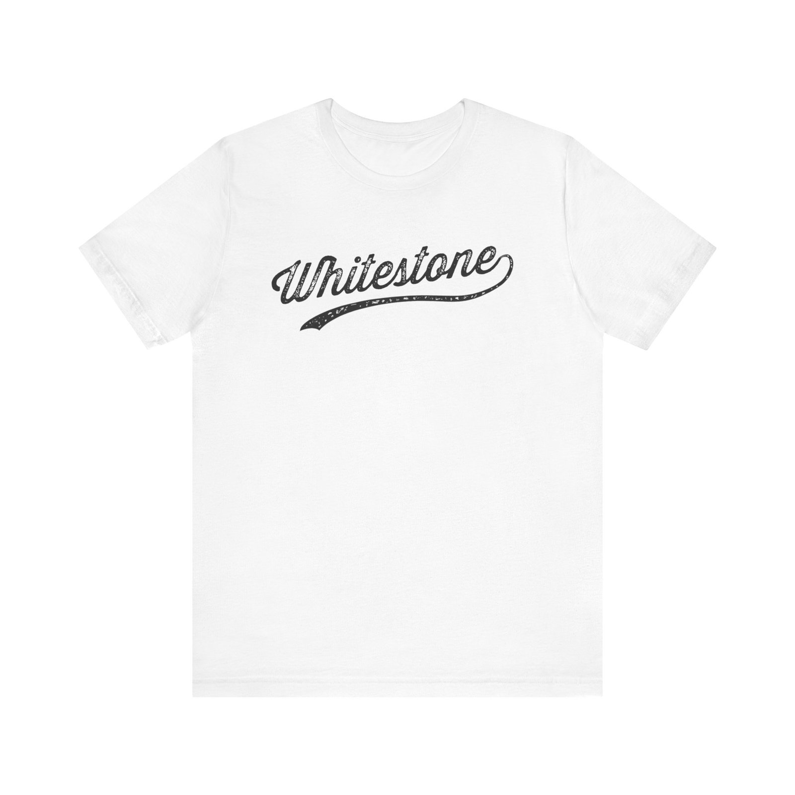 The image features a stylized text rendering of the word “Whitestone” in a vintage, distressed script typography. The lettering appears weathered and worn, with a textured, slightly degraded effect that gives it an aged and nostalgic appearance. The word is rendered in a sweeping, cursive style with an elongated underline that curves dramatically beneath the text. The typography has a retro design aesthetic reminiscent of classic sports jersey or team logo lettering. The distressed texture adds visual depth and character to the typography, creating an authentic, hand-crafted look.