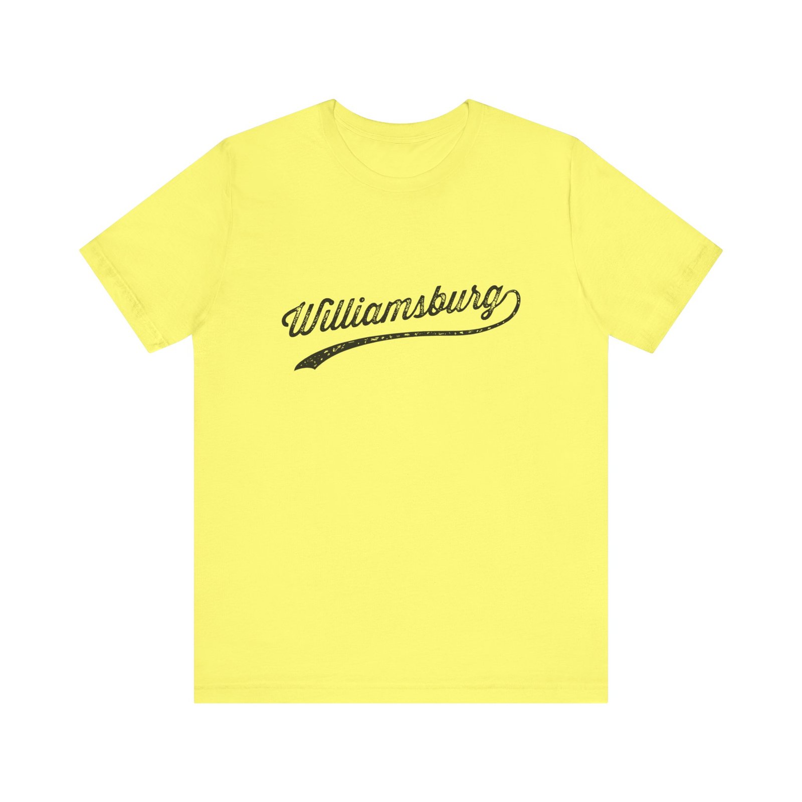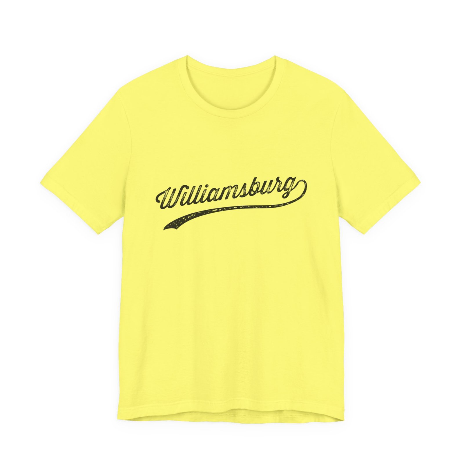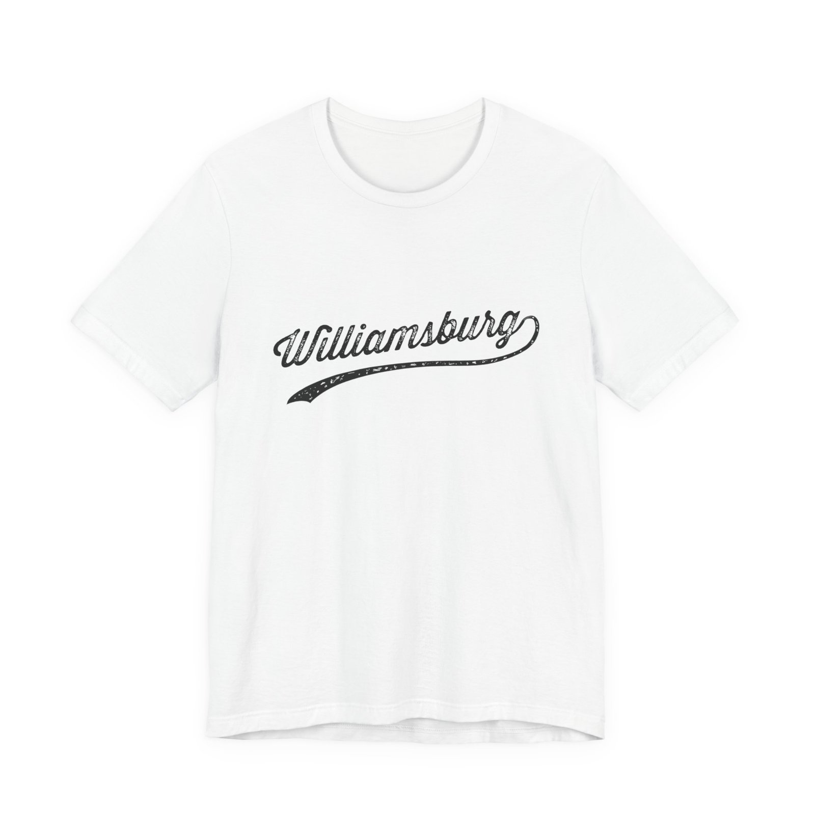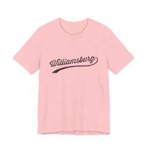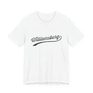 The image showcases the word “Williamsburg” in a vintage, distressed typography style. The text appears to be a logo or branding element with a weathered, textured effect that gives it an aged and nostalgic look. The lettering is designed in a cursive, script-like font with a sweeping underline that extends beneath the text. The stylized typography suggests a retro or classic aesthetic, reminiscent of traditional signage or vintage branding. The distressed texture adds character and a sense of heritage to the word, creating a visually interesting and memorable design.